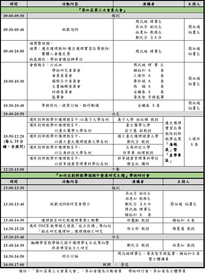 本會將於107年3月17日(六)於國立臺北護理健康大學親仁樓1樓B118舉辦『第四屆第3次會員大會暨學術研討會』,研討會主題為『如何在創新教學過程中發展研究主題』研討會,敬請各位踴躍參加。