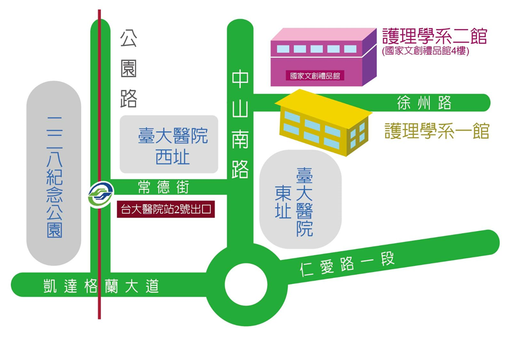 - 搭乘大眾交通工具者:可至台大醫院站2號出口行經常德街,左轉至中山南路後,再右轉徐州路即可抵達。