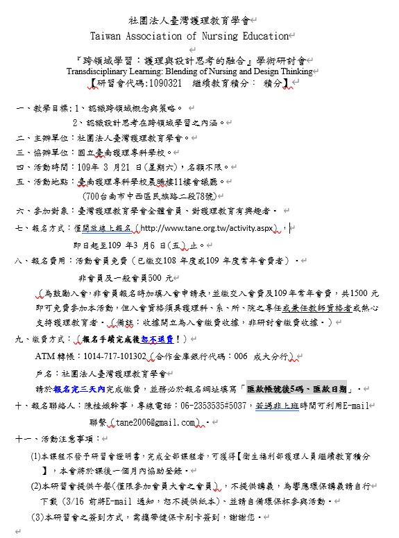 【公告】115年會員大會定於3/28(六)召開!誠摯邀請全體會員出席,共襄盛舉。115年常年會費已開始繳交,ATM轉帳:合作金庫(銀行代碼:006)/臺大分行/1346-872-040614 戶名:社團法人臺灣護理教育學會 /完成後,請至本會網站或來信提供匯款後5碼繳費證明,以便核對。感謝您。