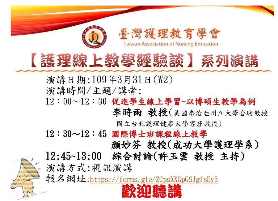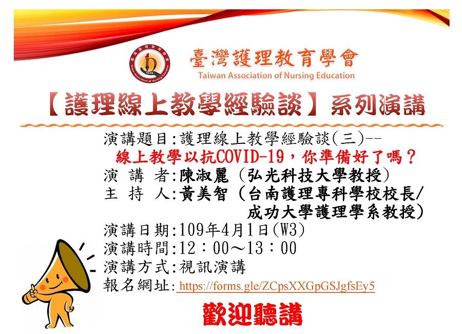臺灣護理教育學會將舉行"護理線上教學經驗談”系列演講(3/31及4/1中午),