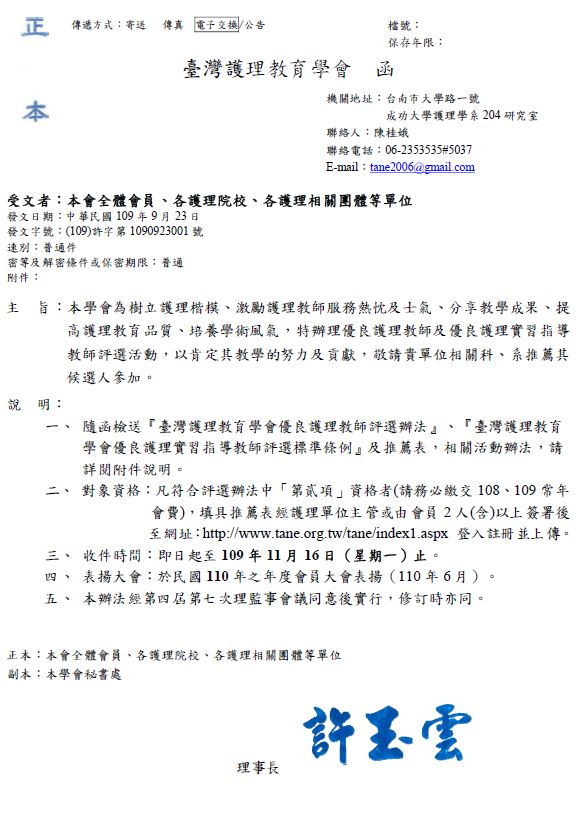 109年度『臺灣護理教育學會優良護理教師』及『臺灣護理教育學會優良護理實習指導教師』甄選,10/1起至11/16截止,歡迎踴躍參選.
