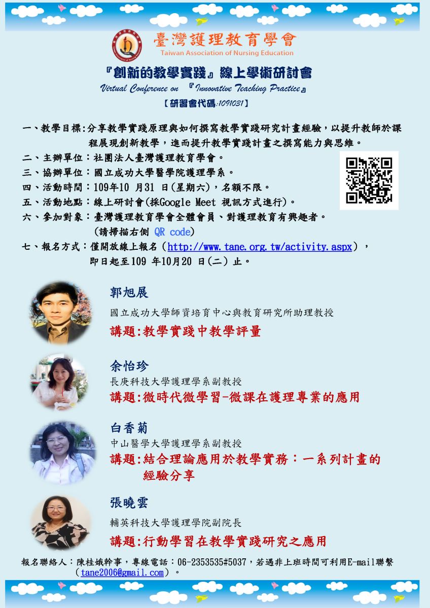 [更正通知]--提供上課證明,不提供繼續教育積分 --109/10/31(六)9:20-12:00『創新的教學實踐』線上學術研討會,歡迎踴躍報名!!